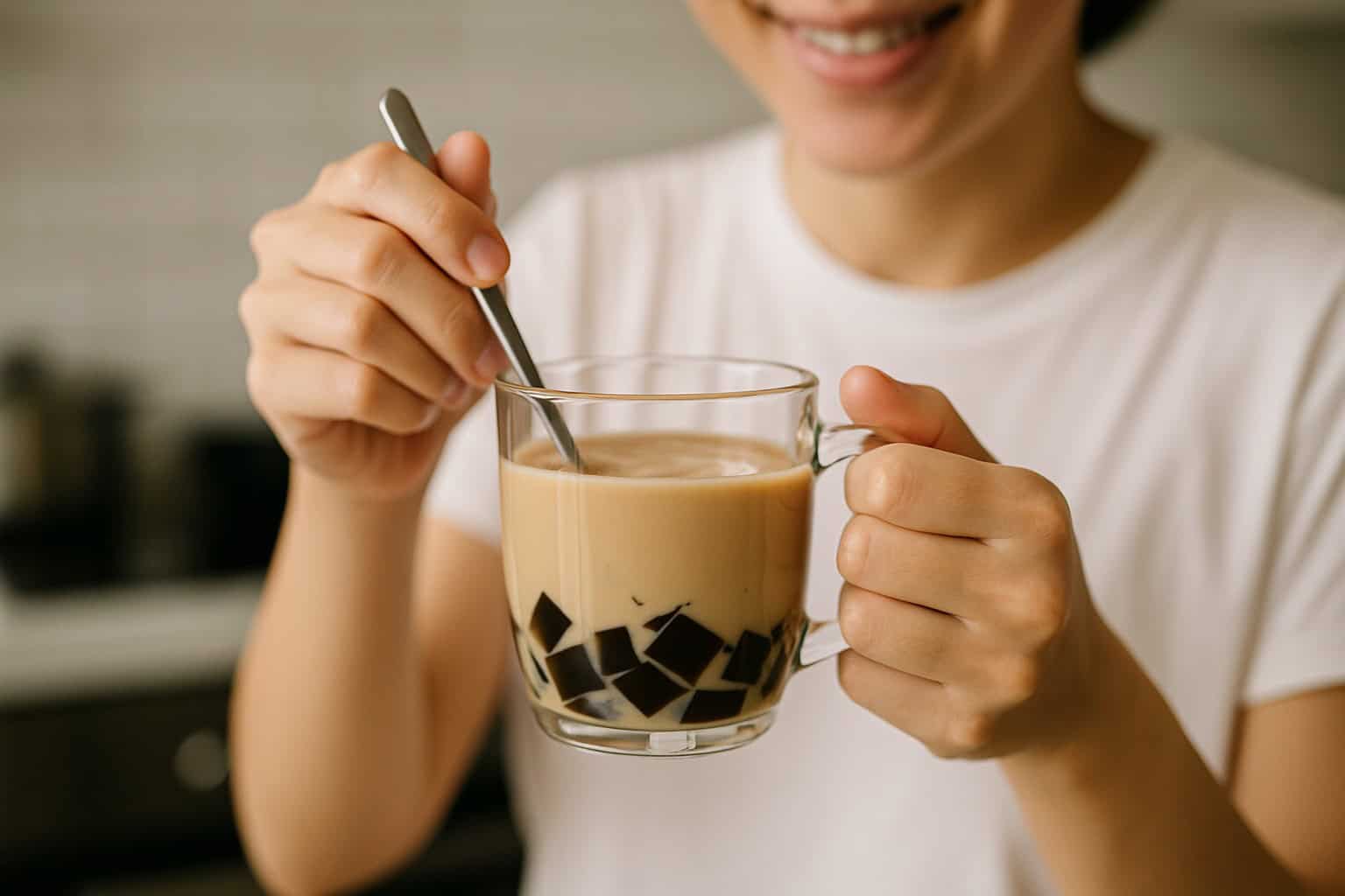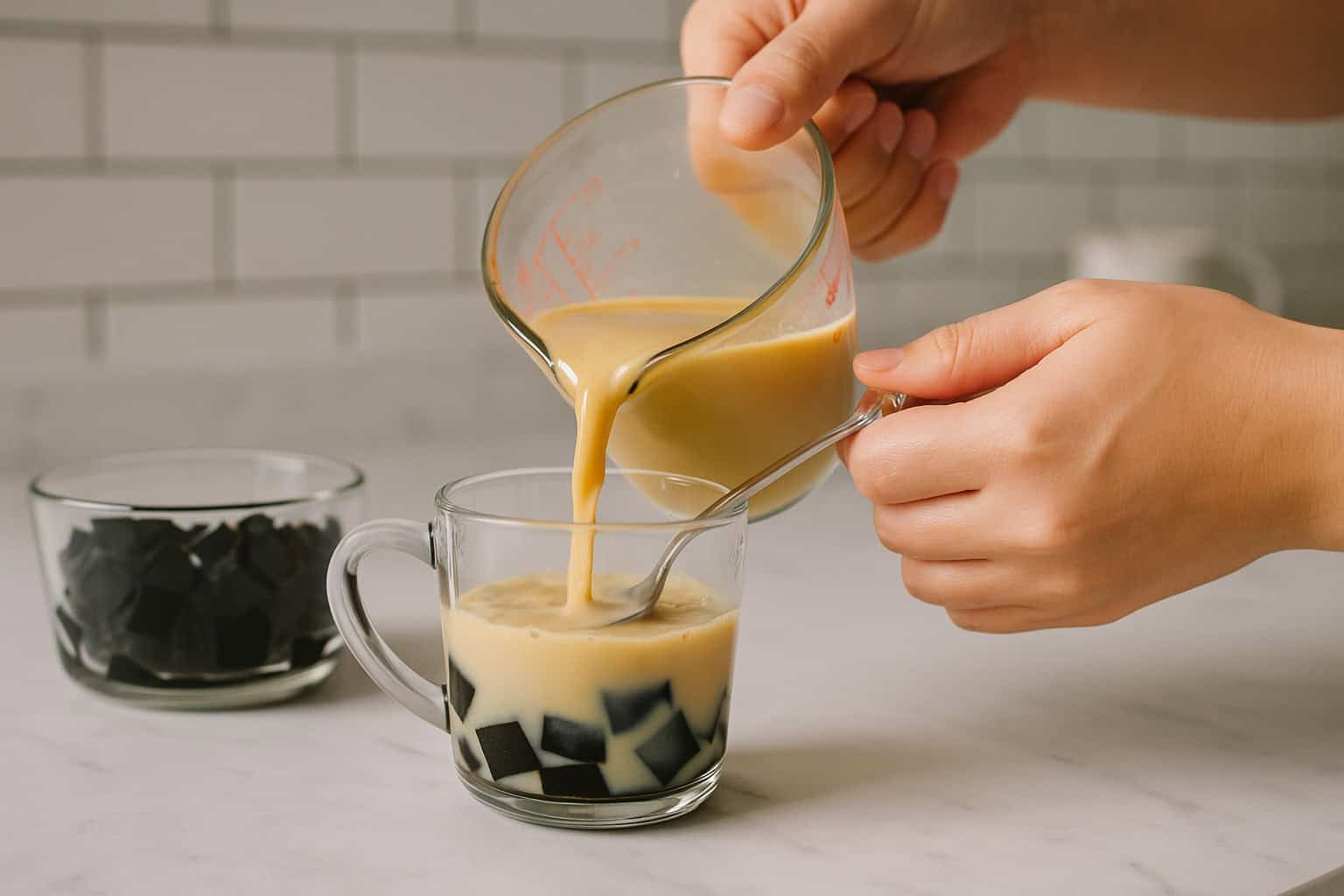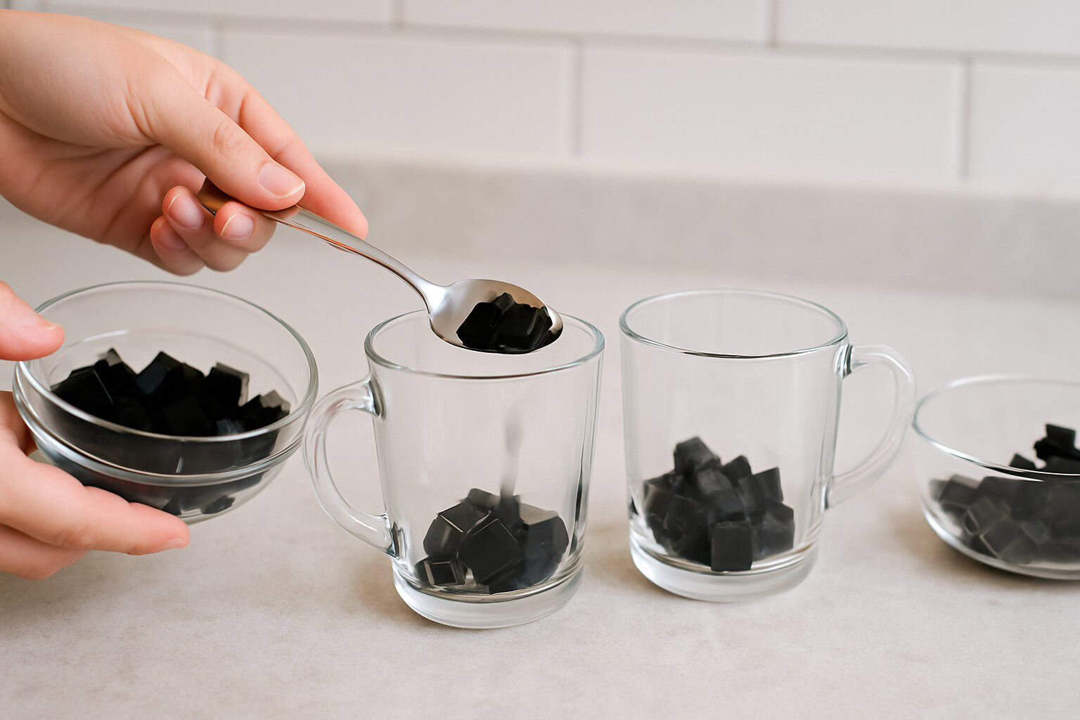 Place about ¼ cup of glass jelly into two mugs. Keep any leftover jelly in a covered container and keep it in the fridge.