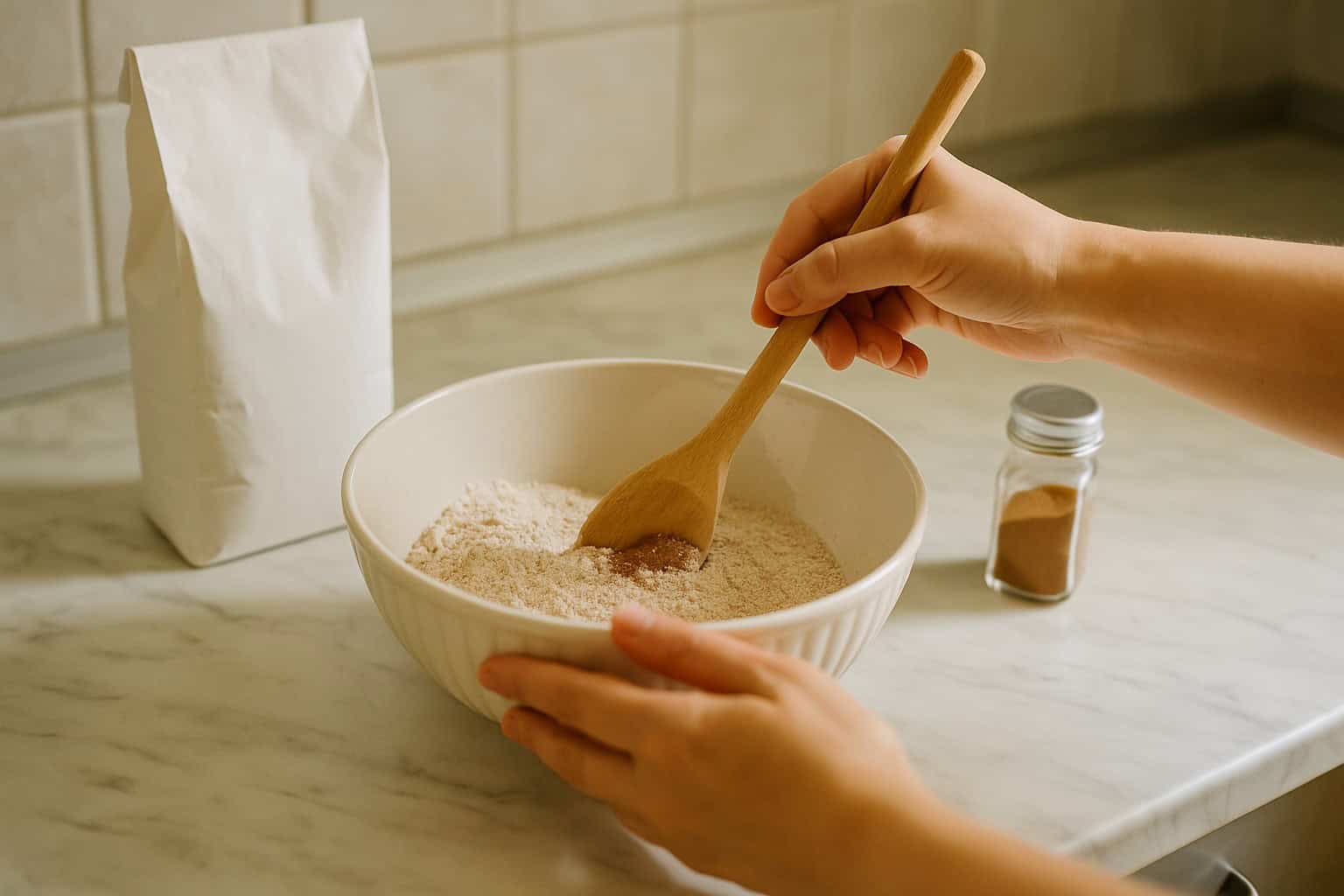 In a large bowl, combine the wholemeal flour, baking powder, ground cinnamon and salt.