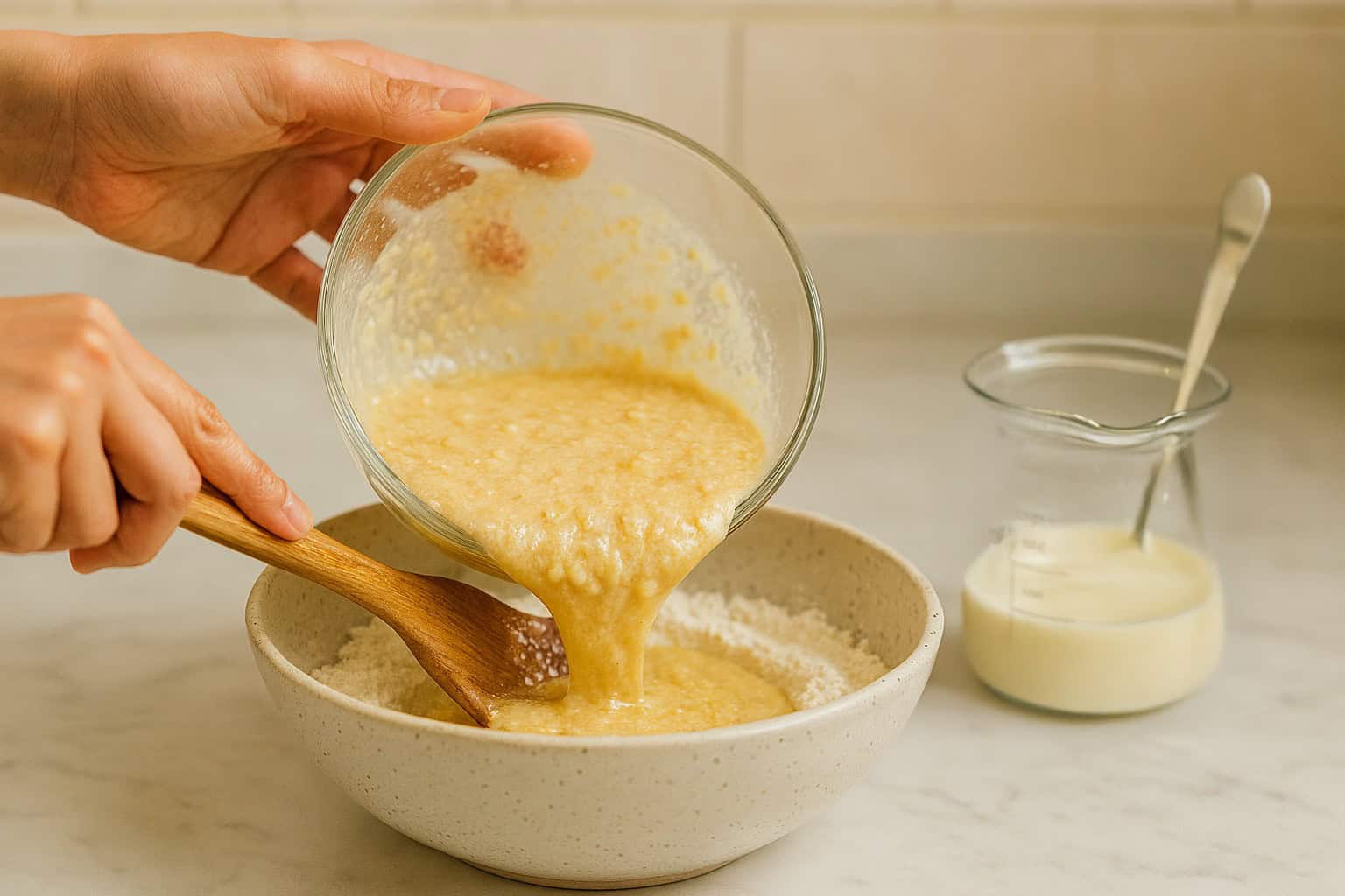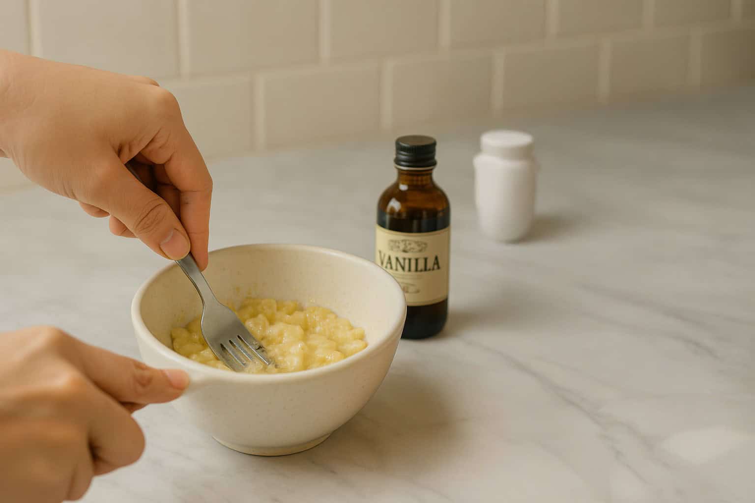 In a separate smaller bowl, mash the banana. Add the egg, Dutch Lady Kurma Flavoured Milk, Greek yogurt, and vanilla. Whisk everything to combine.
