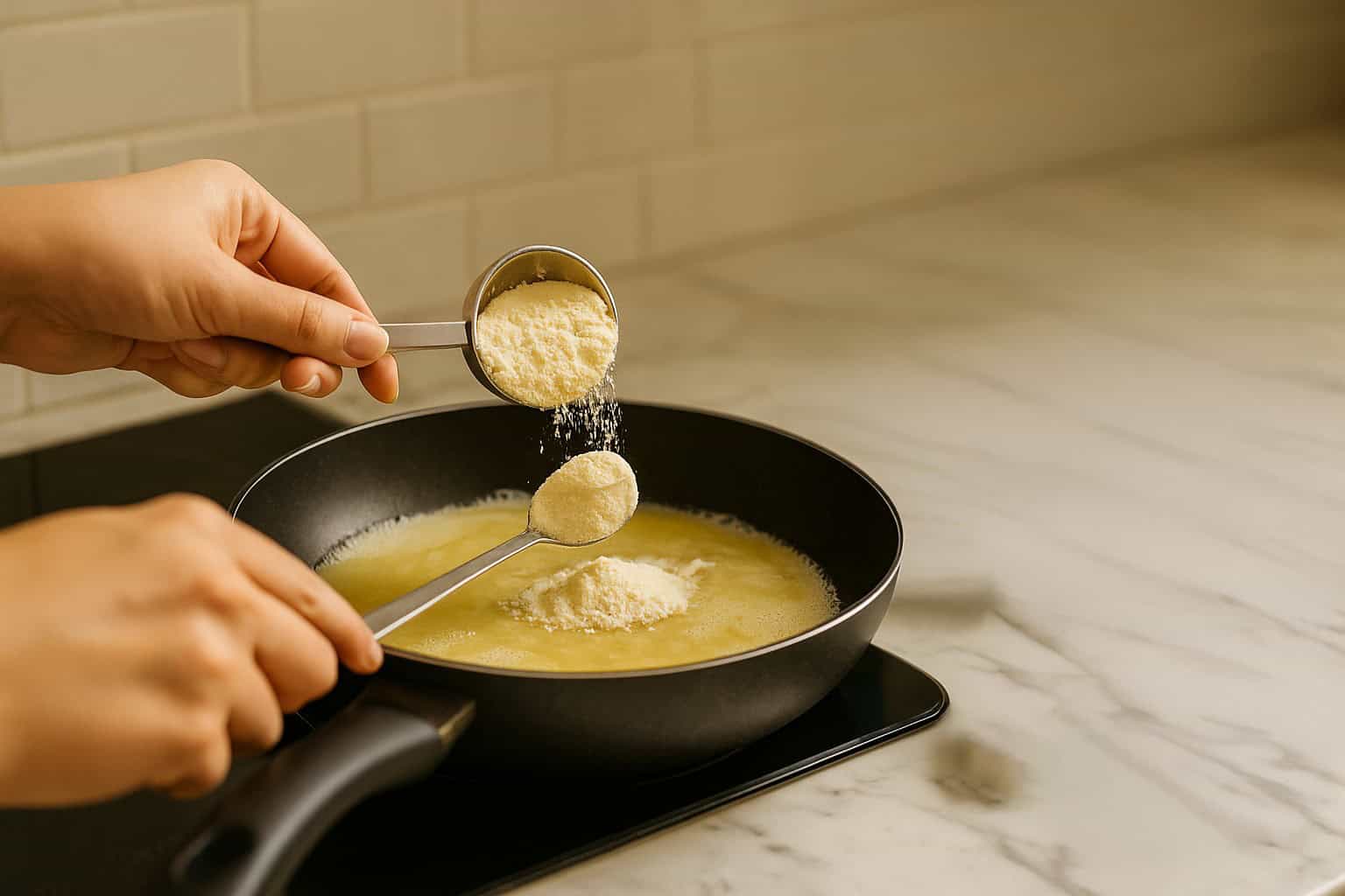 Add ½ cup of Dutch Lady Full Cream Milk Powder, mix both ingredients on a low flame.